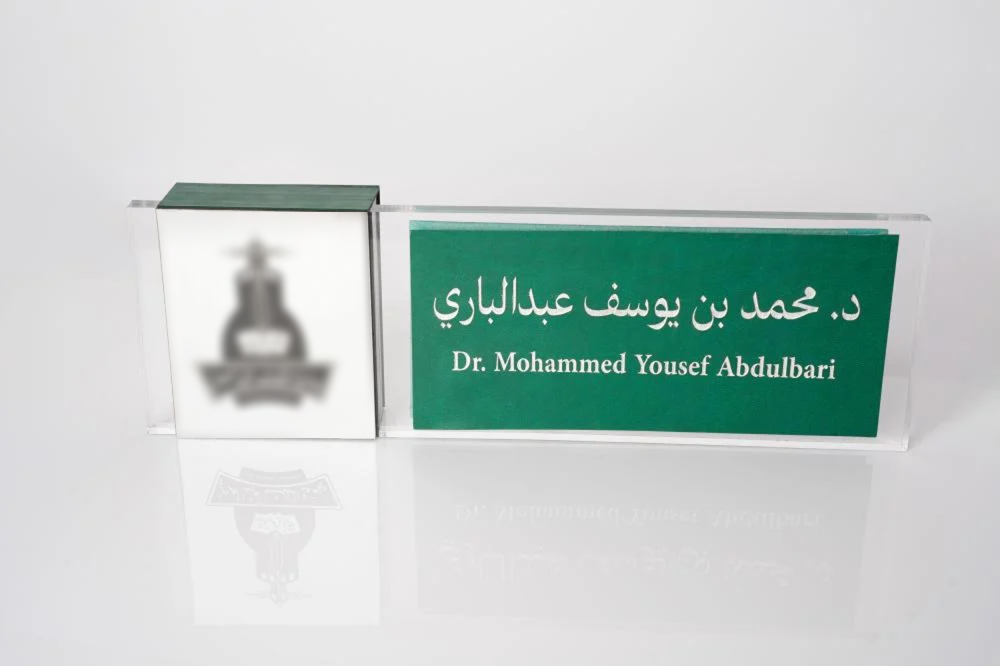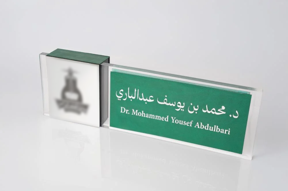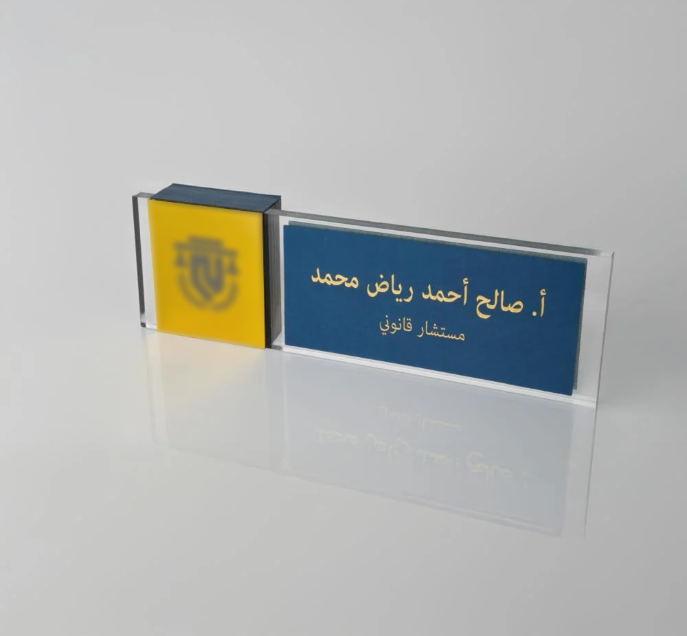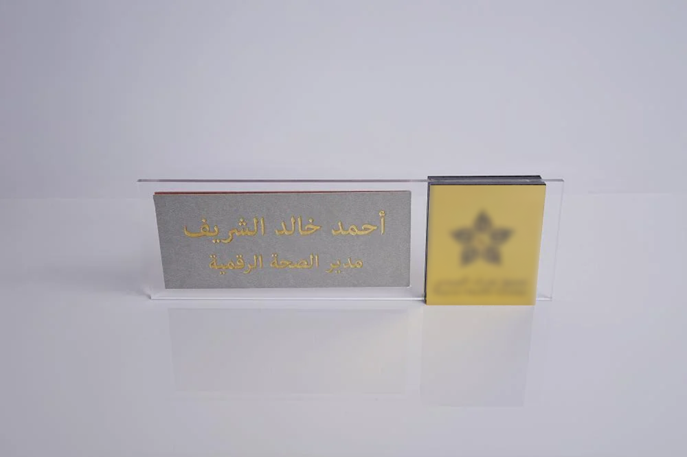 استاند مكتبي يجمع بين الحداثة والفخامة، حيث يتم حفر الاسم على جلد ايطالي فاخر لإضفاء لمسة راقية تعكس الذوق . ويتم حفر الشعار بدقة على سندويش بانل معدني ليمنحه مظهرًا احترافيًا متينًا،. تصميمه يجمع بين الجمال والمتانة مهنية راقية.