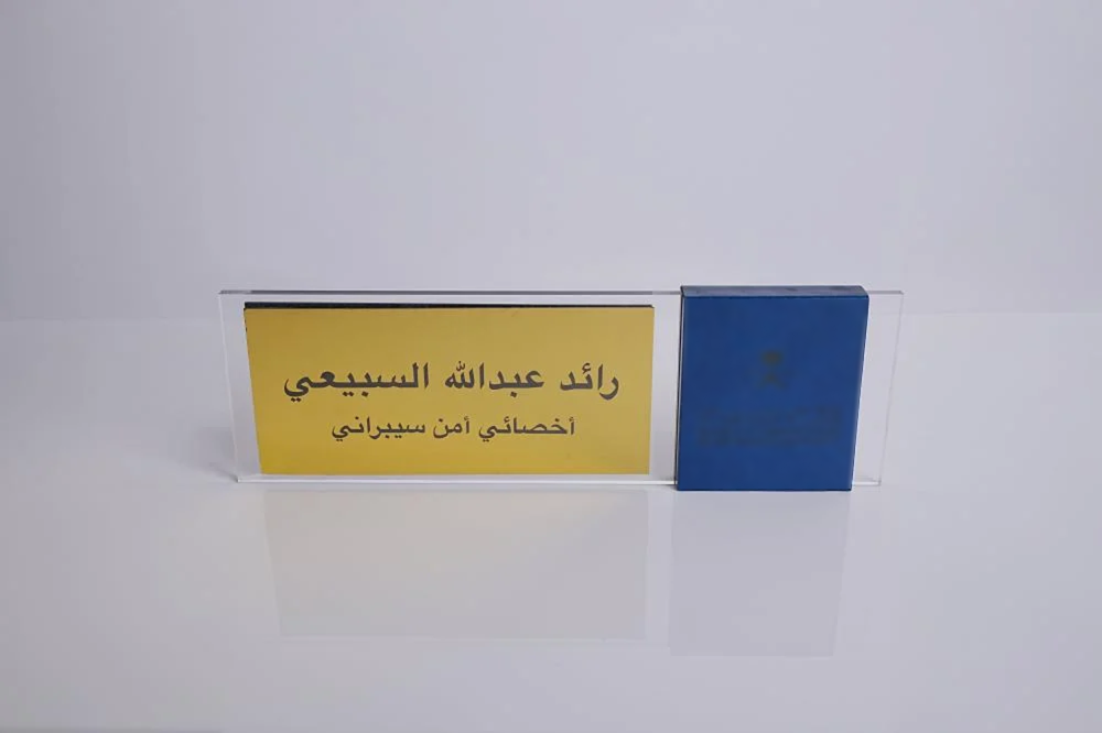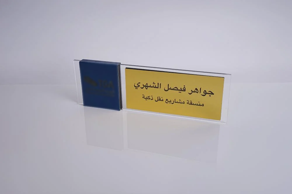استاند مكتب بالاسم أنيق فخم وعملي، حيث يتم حفر الشعار على جلد فاخر لإضفاء لمسة راقية، ويتم حفر الاسم على سندويش بانل معدني يمنح التصميم متانة وأناقة إضافية.