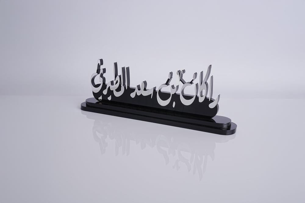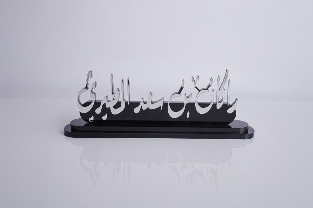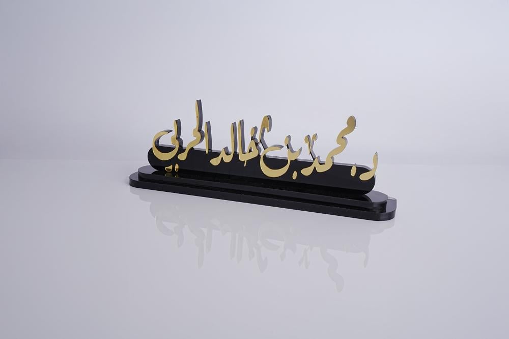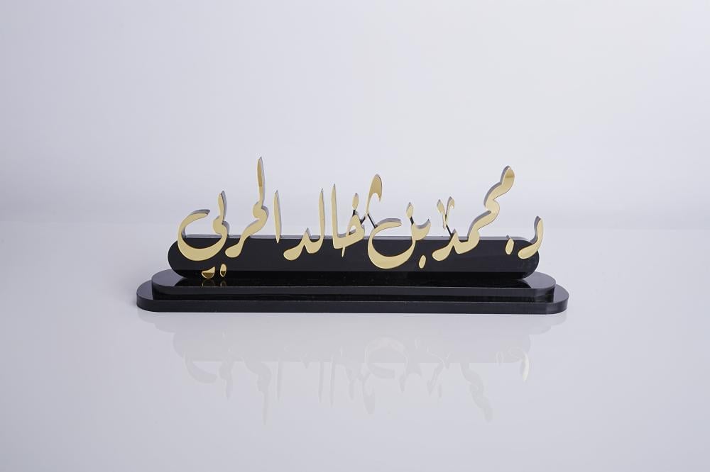 يتم كتابة الاسم بالأكريليك المفرغ مع اللون الذهبي الفاخر ليعطيك ستاند للمكتب لمسات جمالية عصرية راقية