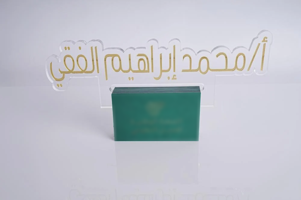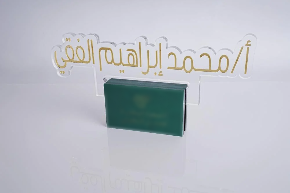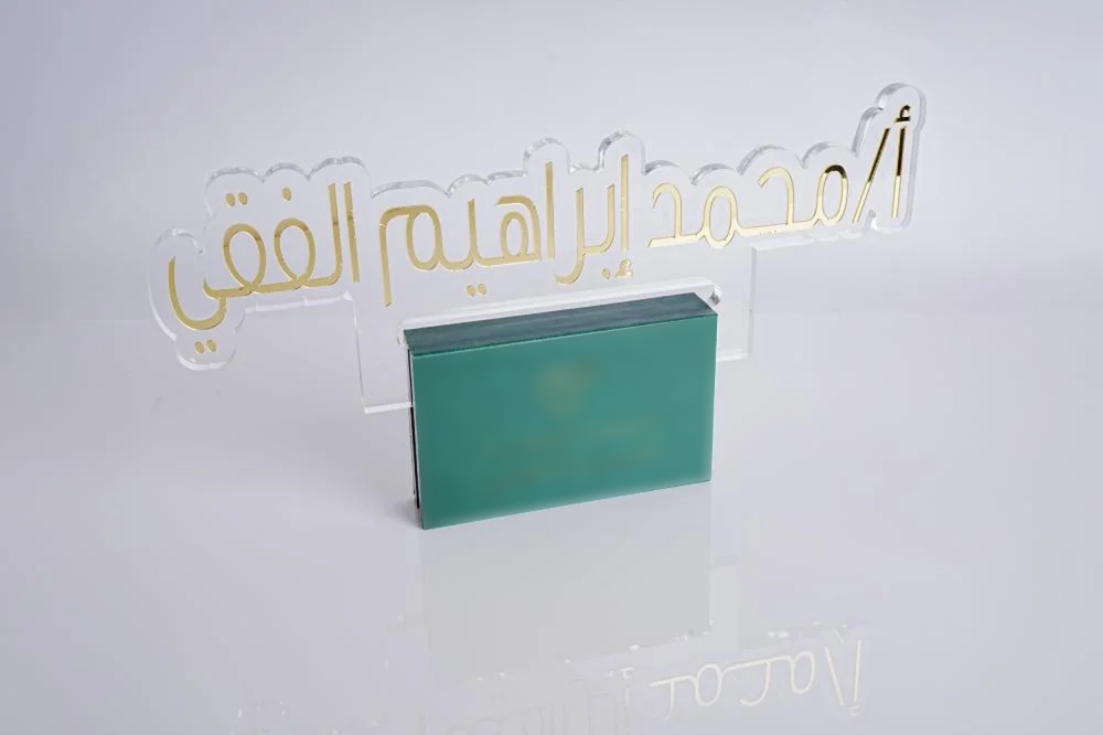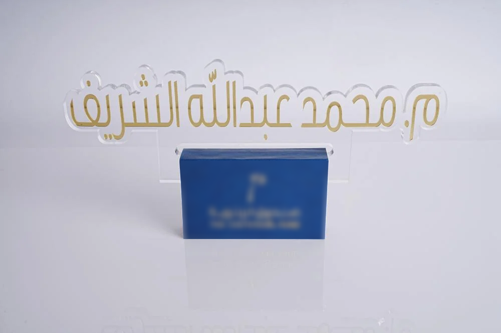 تم تصميم الستاند من الأكريليك الشفاف مع كتابة للاسم مفرغة باللون الذهبي والفضي اللامع ليعكس الفخامة والأناقة.